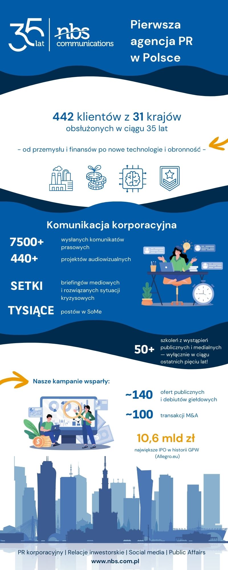 – Nasze 35 lat to historia rynku, który tworzył się na naszych oczach. Zaczynaliśmy, kiedy nie było internetu, social mediów ani inwestorów indywidualnych w dzisiejszym znaczeniu, a PR był w Polsce nowością. Dziś doradzamy firmom, które komunikują się jednocześnie z inwestorami, klientami, regulatorami czy społecznościami lokalnymi. W tym czasie zmieniło się wszystko – oprócz standardów, które stworzyliśmy – mówi Anna Krajewska, założycielka NBS Communications.